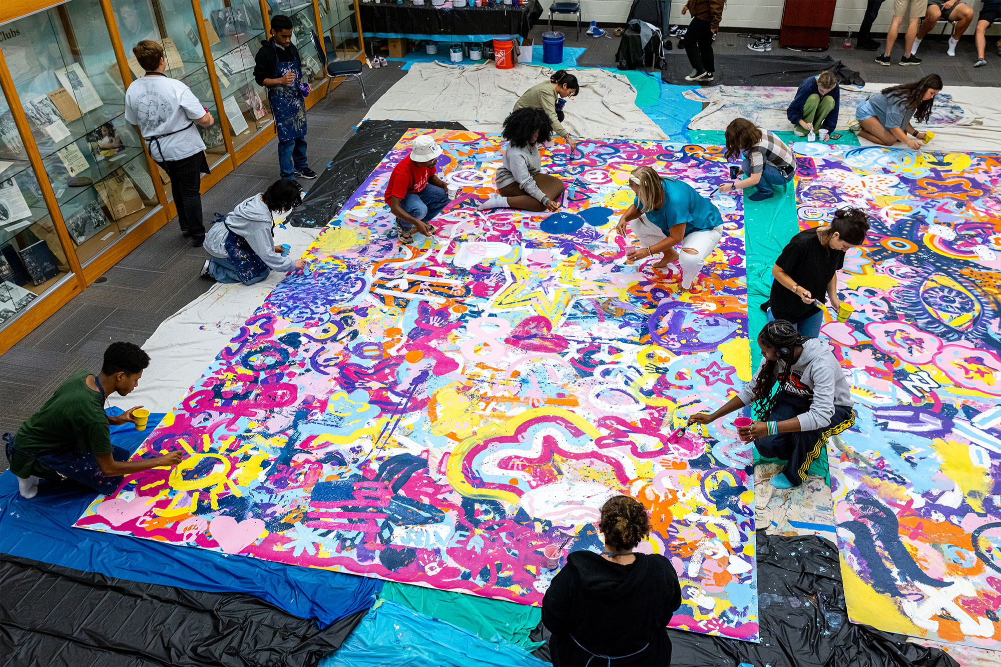 Working with Paint Love, the students shared their initial thoughts to inform the design, specifically on how the piece should be “multi-layered,” with “bold shapes, colors, and movement,” and include “symbols that represent different people or things.”