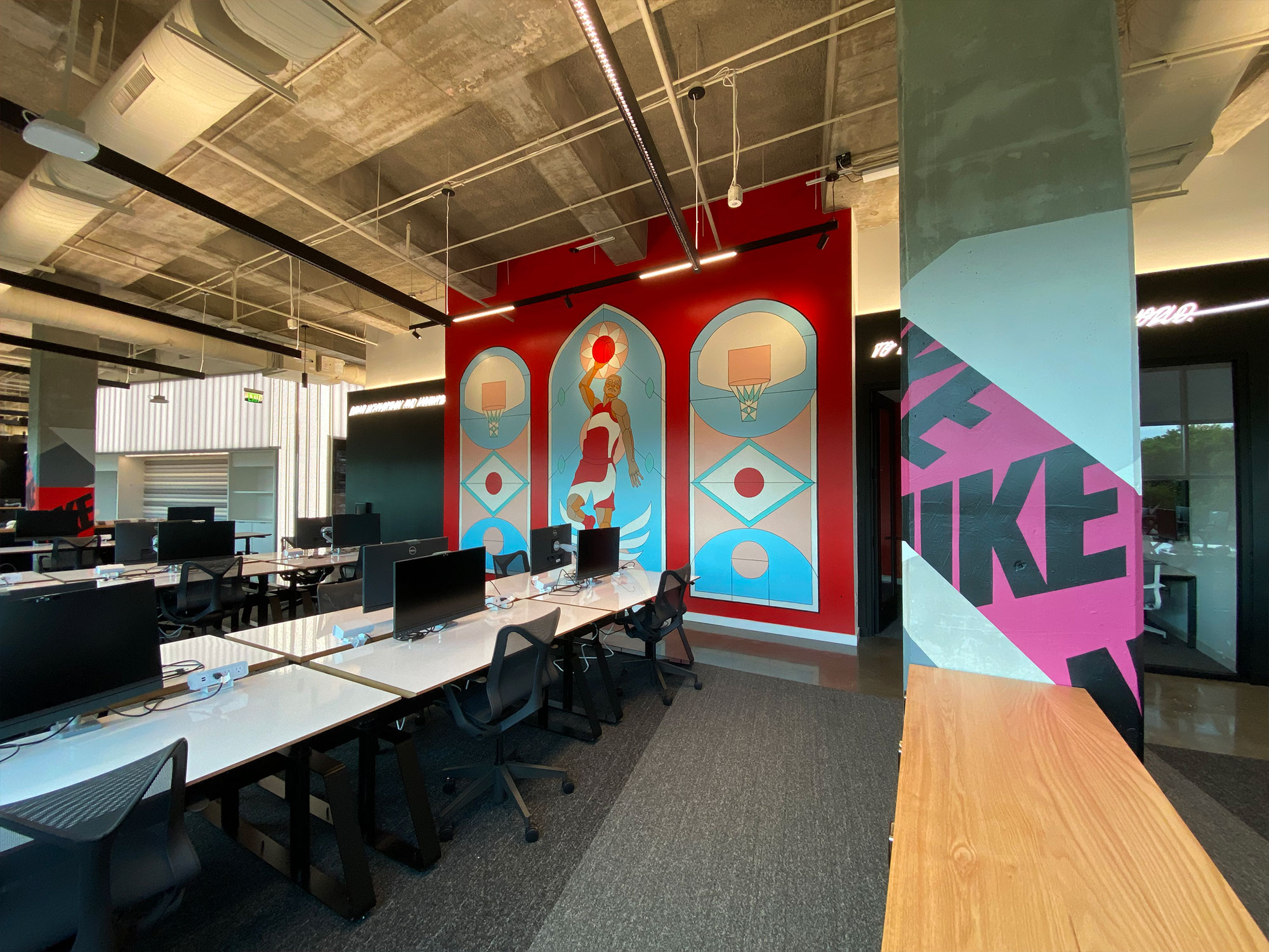 Nike opened an office in Atlanta, and they wanted to express their brand ethos in a way that captured a feeling of pride in the city. Their creative team allowed me the freedom to develop a design for their working space, one that blended together hallmarks of the city, of sport, and of art.